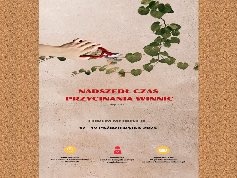 Dzień skupienia z cyklu : „Spragnieni Słowa Bożego”Kazanie na górze”- Mt 5,1-17 Sanktuarium św. Urszuli Ledóchowskiej w Pniewach, sobota 11.10.2025 r. w godz.10.00-17.00prowadząca: s. Maria Piętak USJK. Zgłoszenia pod nr tel.