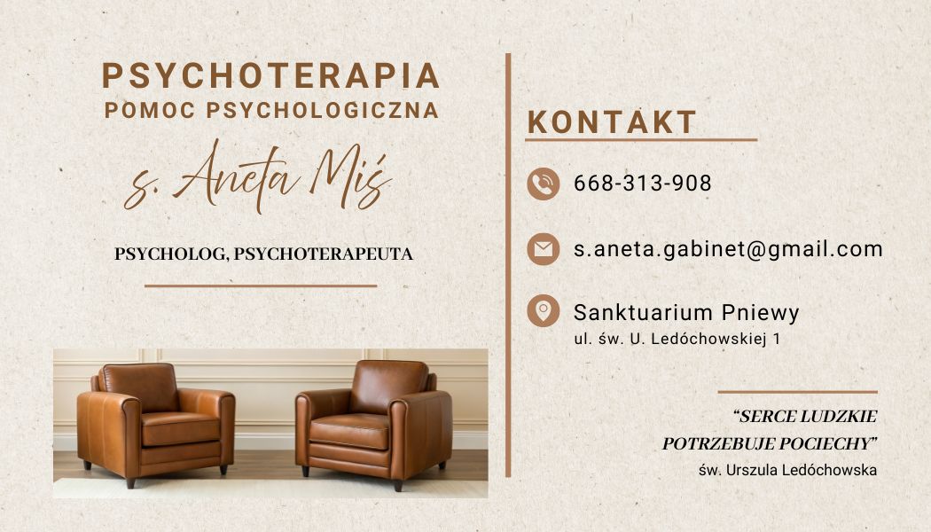 psycholog, psychoterapeutka, od trzydziestu lat w Zgromadzeniu Sióstr Urszulanek SJK. Ukończyła 4-letnie Studium Psychoterapii SPCh w Poznaniu. Pracuje indywidualnie w nurcie integracyjnym z dorosłymi i młodymi dorosłymi pomagając osobom zmagającym się z problemami emocjonalnymi, depresją, lękami, trudnymi doświadczeniami z przeszłości, poczuciem niskiej wartości, a także towarzysząc osobom, które pragną w gabinecie psychoterapeutycznym bardziej przyjrzeć się sobie i zrozumieć siebie, by pełniej żyć.