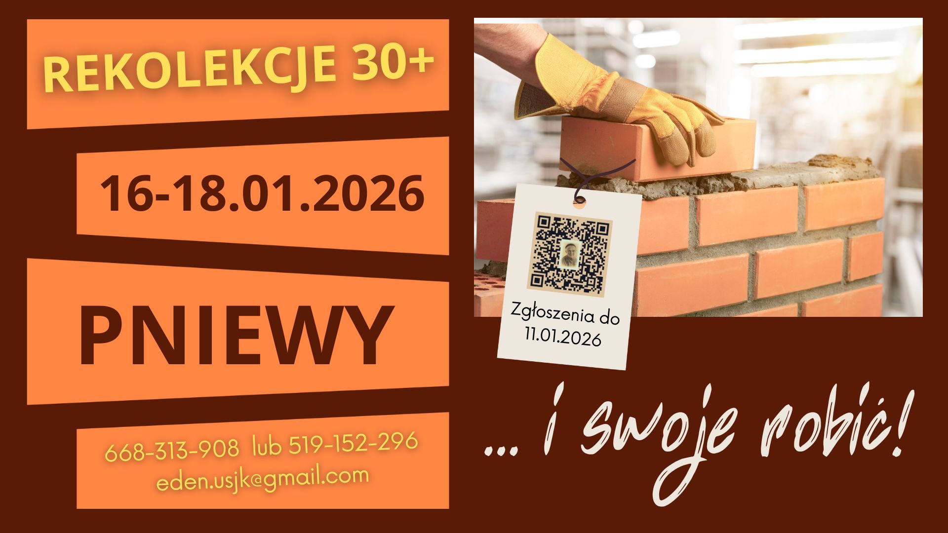 Zapraszamy Cię na rekolekcje, podczas których spotkasz innych wznoszących budowlę Kościoła: tych współczesnych Tobie zwyczajnych ludzi oraz tych, którzy są fundamentami tej budowli: ludzi Biblii, a zwłaszcza proroków, oraz tę, która jest Patronką tego miejsca – św. Urszulę Ledóchowską, która „robiła swoje” wsłuchana w głos Mistrza.